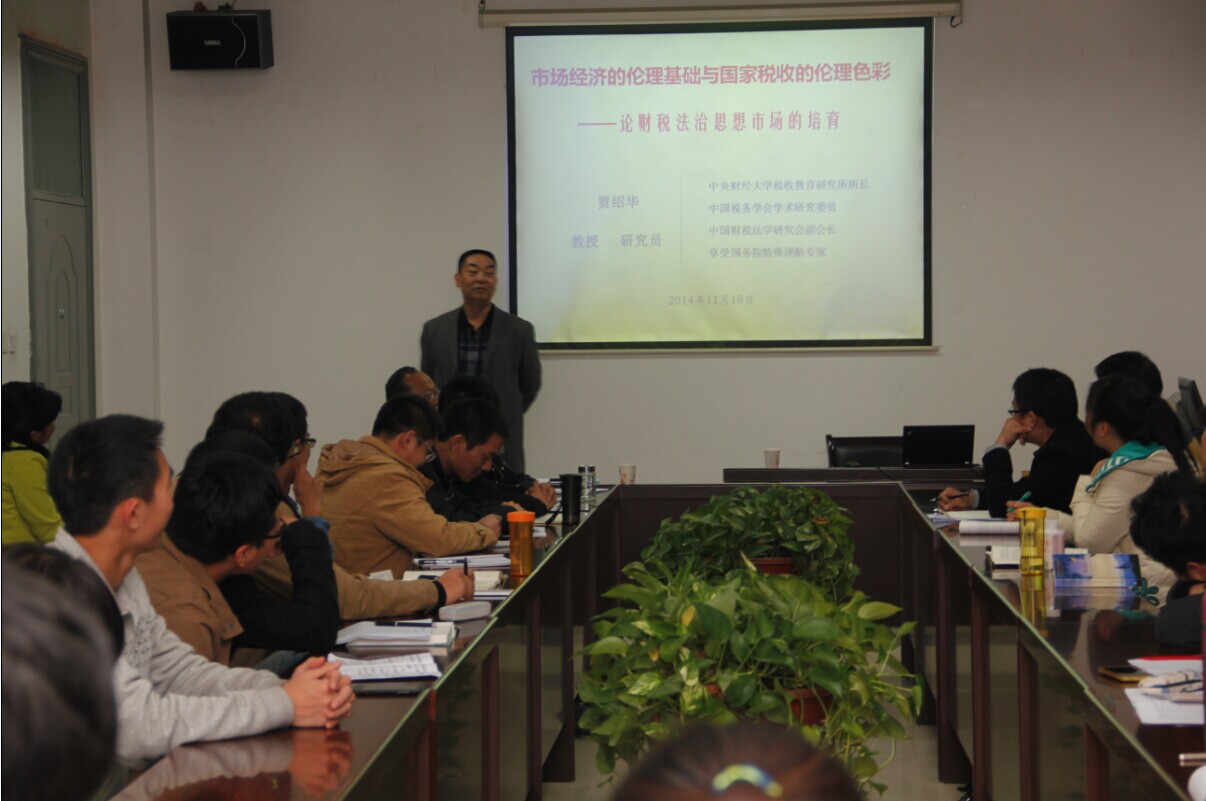 本次活动是由中央财经大学教授、中央财经大学税收教育研究所所长、中国财税法学会副会长贾绍华教授主讲,我院王鸿貌教授担任主持人,讲座题目是《市场经济的伦理基础与国家税收的伦理基础》。贾教授以一个幽默的小故事开场,引出生活中经济思维、法律现状以及伦理道德方面存在的问题,并通过现实案例以及经济学理论的分析讲述,指出伦理道德在市场经济运行中的重要地位,解释了现行税法中个人所得税、增值税等主要税种存在的伦理基础。