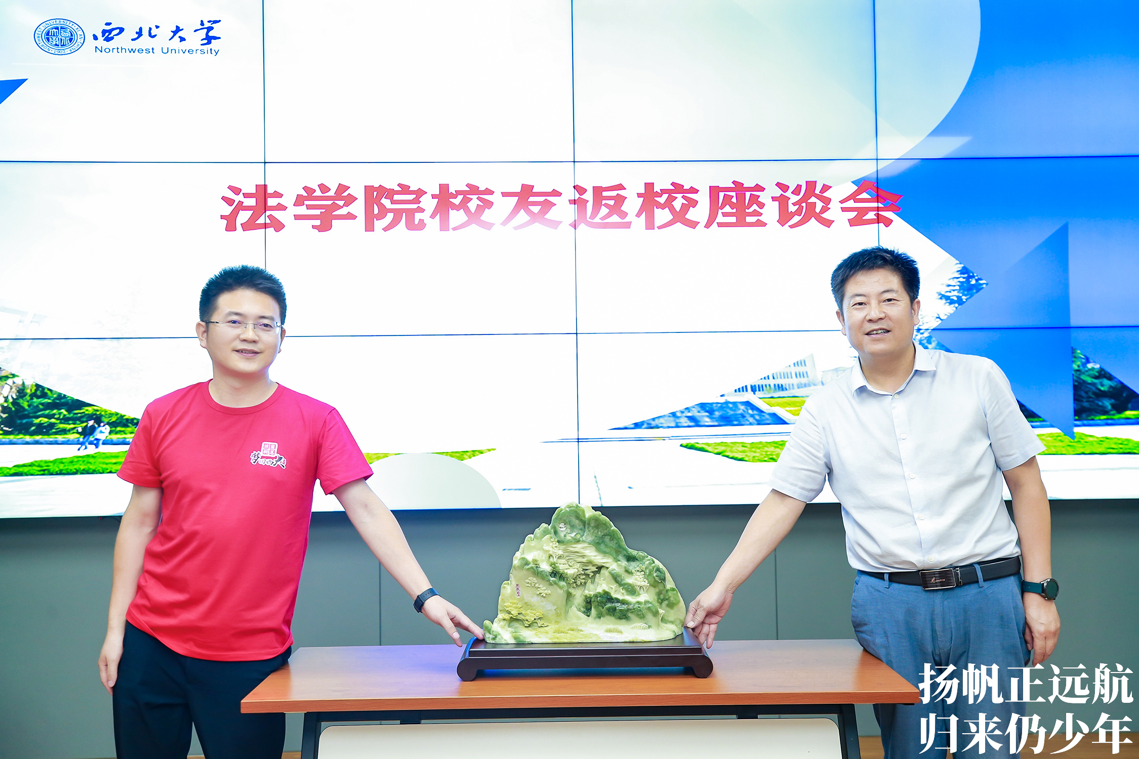 会上,返校校友为表达自己对母院感恩的情怀,特向学院赠送了蓝田玉雕作品“蒸蒸日上”,祝愿学院事业蒸蒸日上,越办越好!