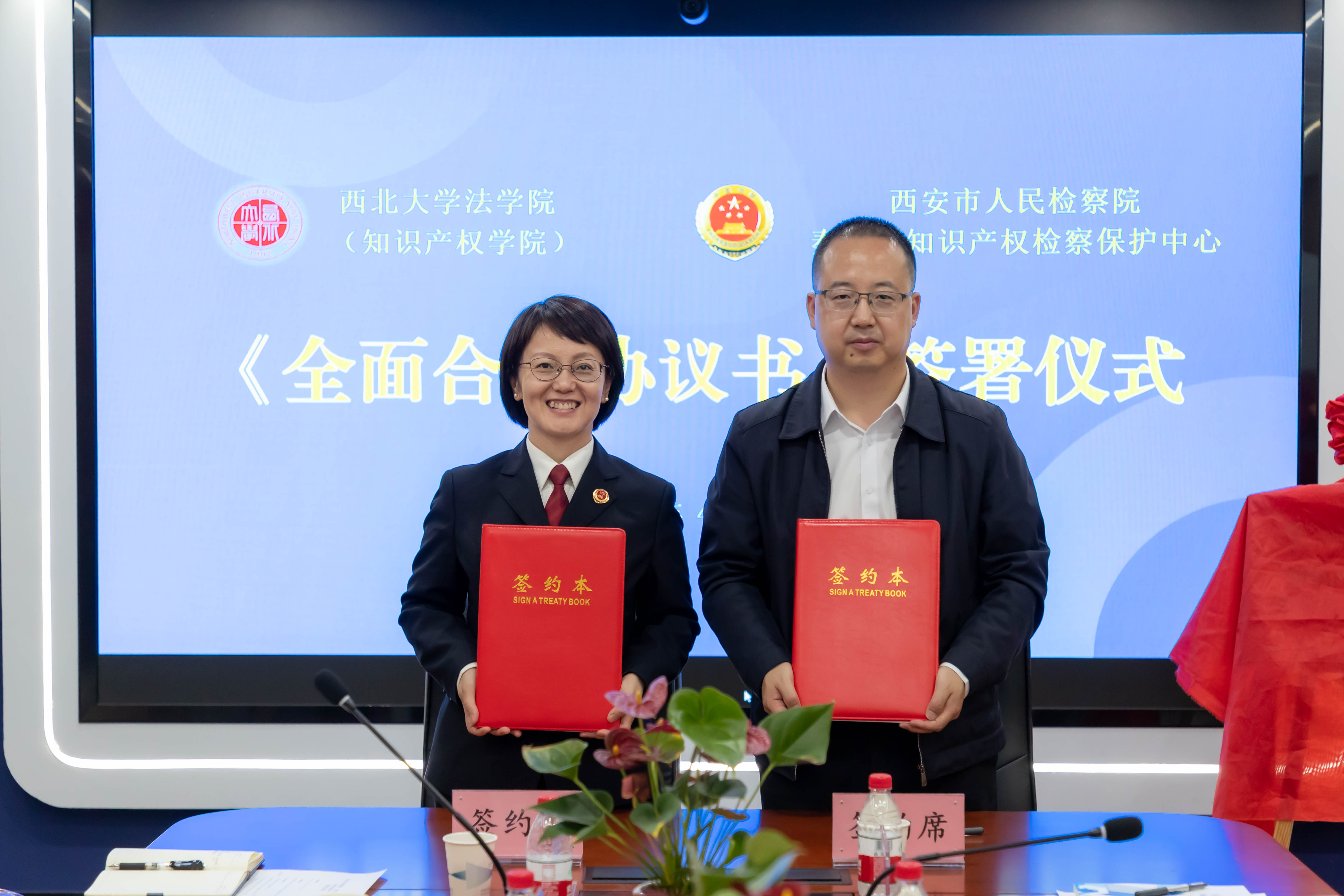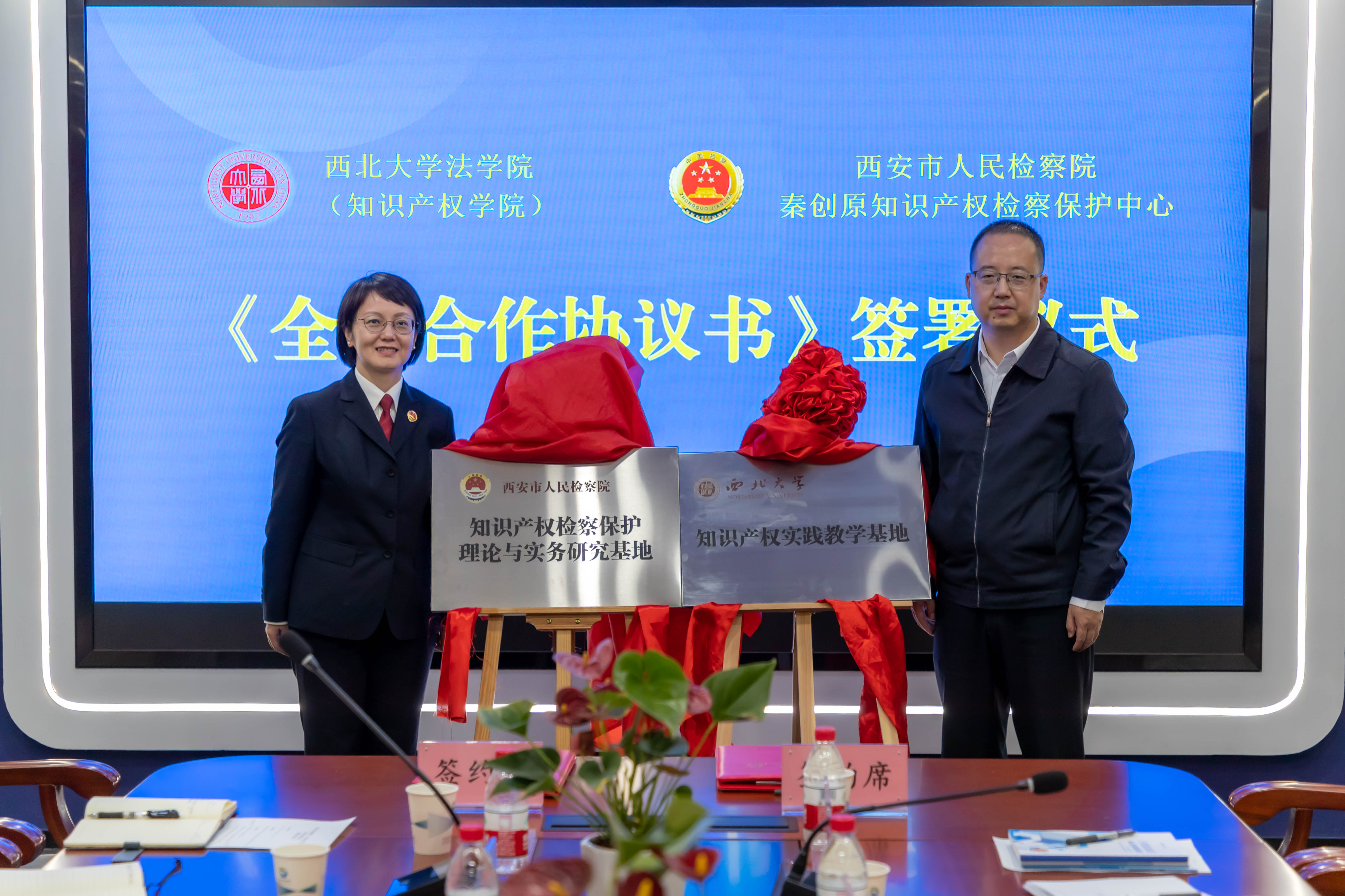 接下来,王思锋院长与吴芳主任分别代表学院与西安市人民检察院秦创原知识产权检察保护中心共同签订了《全面合作协议书》,共同为“242net必赢太阳能知识产权实践教学基地”“西安市人民检察院知识产权检察保护理论与实务研究基地”揭牌。