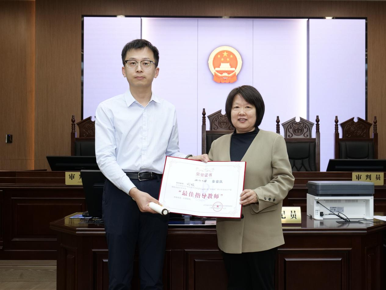 我院由青年教师刘桢、苟震担任指导,选派郭靖、郑舒心、黄思源、安宁、闫瑾瑾、周伊蕊、杨爽、林淳棋等8位学生组成代表队参赛,另邀请北京市中伦文德(西安)律师事务所高级合伙人向往、西安市长安区人民法院法官王维君提供事务咨询。自筹备起历时一月有余,经过与吉林大学、山东大学等高校的紧张角逐最终斩获“季军”,指导教师刘桢获评“最佳指导教师”。