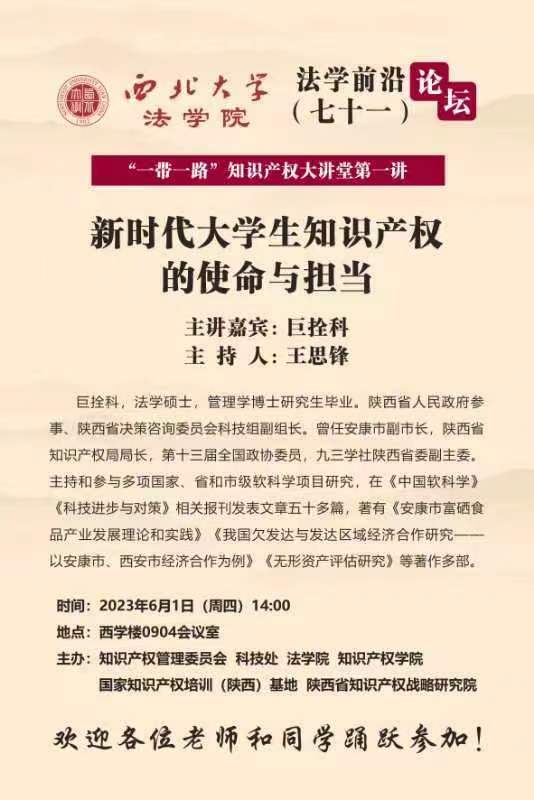 法学前沿论坛暨“一带一路”知识产权大讲堂第一讲——新时代大学生知识产权的使命与担当