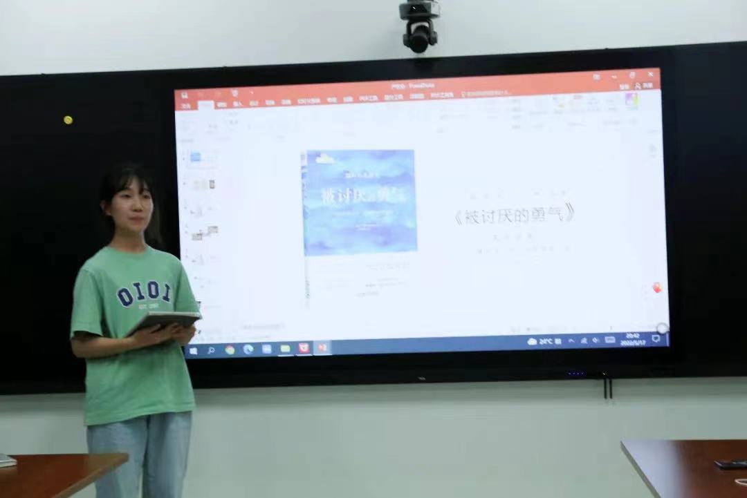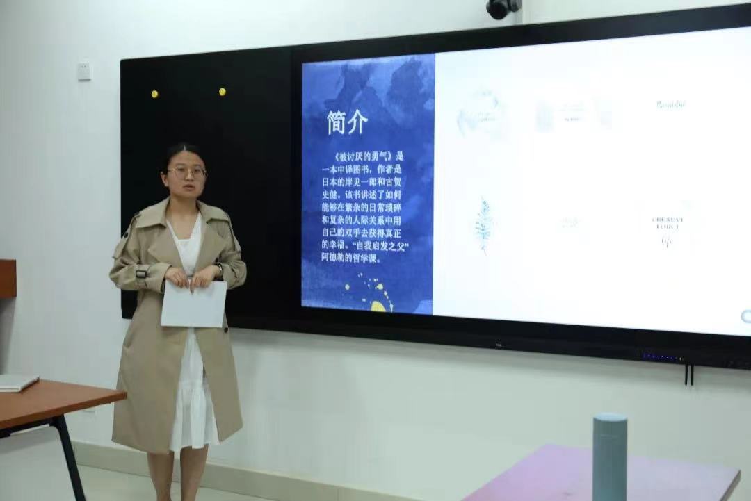 21级庞佳给我们带来的是《被讨厌的勇气》,从书籍简介、思想内容、主题和金句这四个板块来分享。她着重为我们讲述了自卑感(人际关系中对比产生的自卑情结),人生课题(课题分离论),存在便有价值(价值不是从行为中获得的),活在当下(接受自己不能改变的任事物) 。最后从整本书的视角,提出整本书的价值:这本书对过来人可能就是对过去生活的总结与升华,但对入世未深的大学生则是情绪的向导,为我们提供大量的建设性意见,指引我们向正确的方向发展自我。