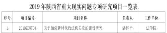 近日,陕西省哲学社会科学工作办公室公布了2019年陕西省重大现实问题专项研究项目(省级重大项目)立项名单。我院潘怀平教授申报的《关于加强新时代政法机关党的建设研究》获得陕西省重大现实问题研究项目立项。