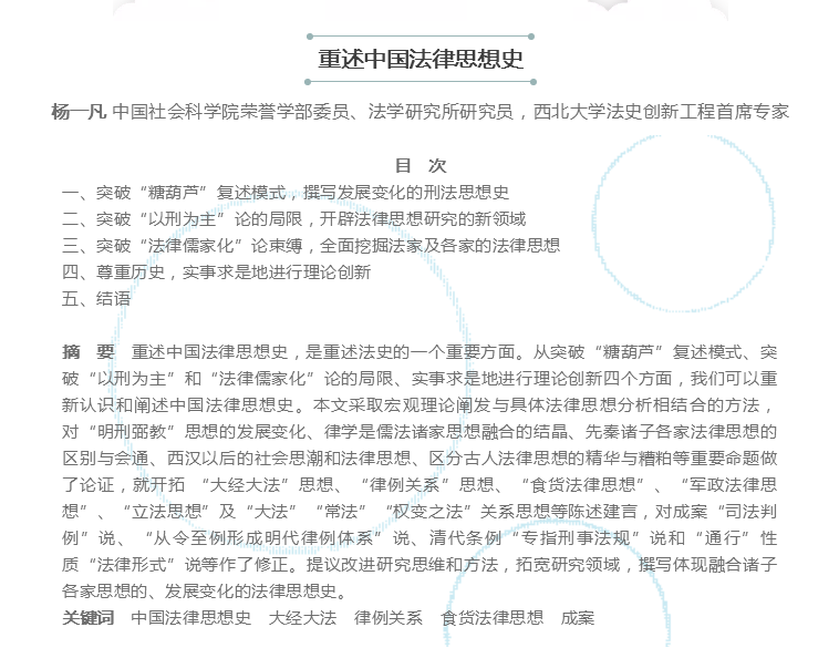 近日,我院学部委员工作室首席专家杨一凡教授撰写的《重述中国法律思想史》在《华东政法大学学报》2021年第4期刊发。